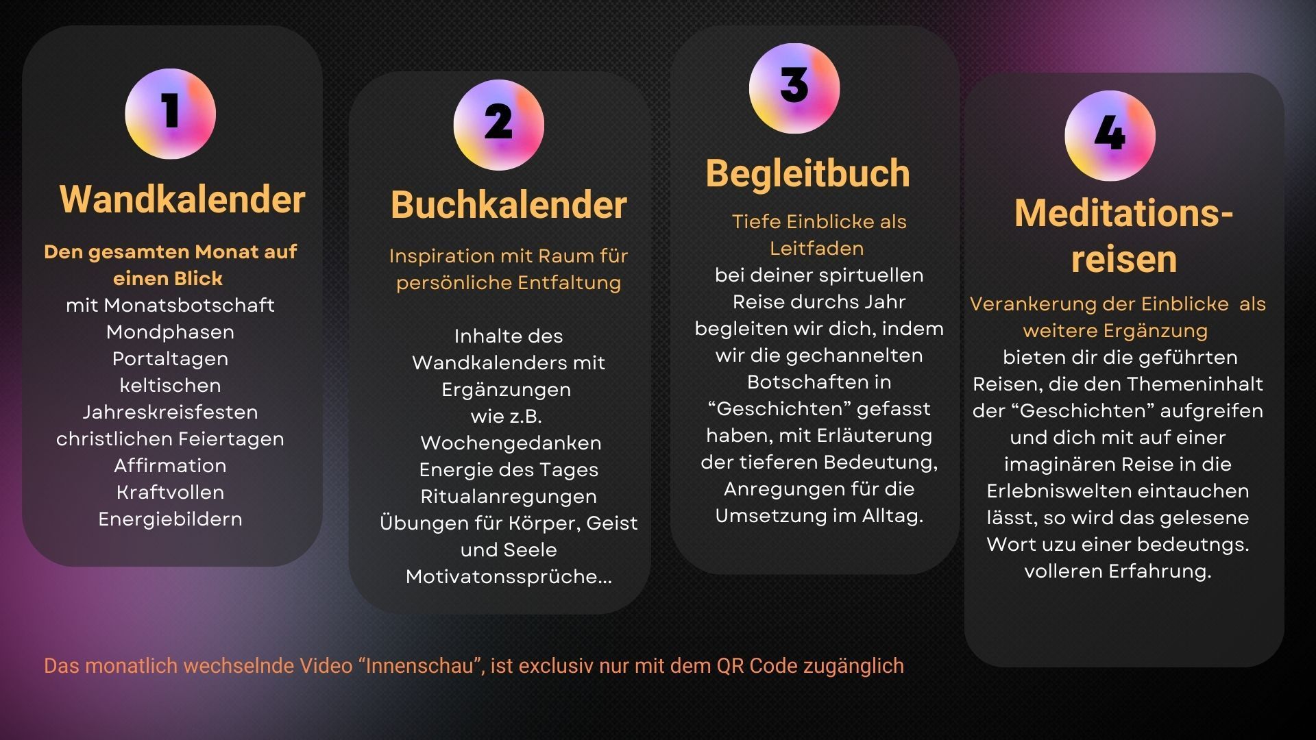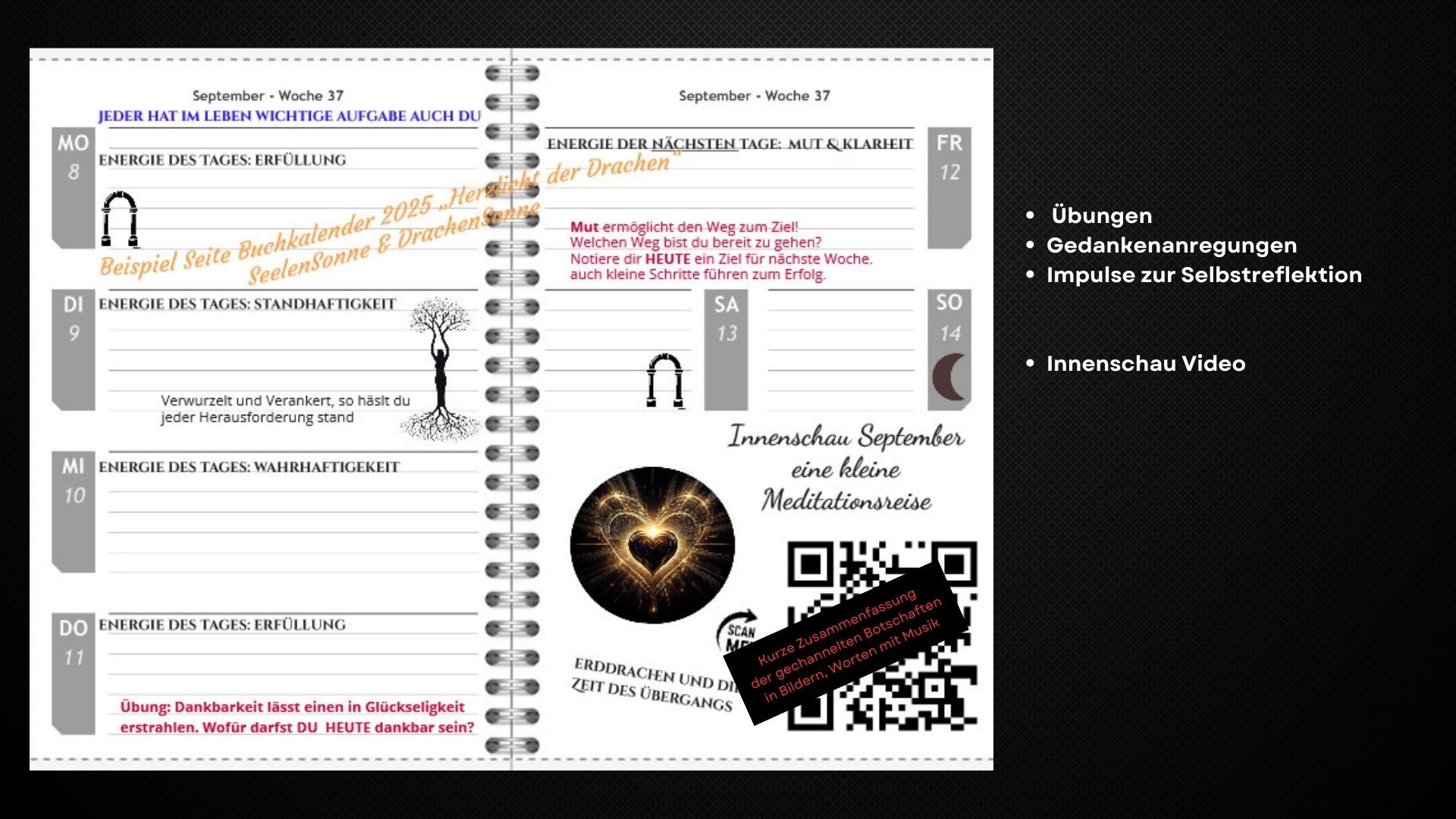 - Monatliches Innenschau-Video: Lasse dich von unserem exklusiven Innenschau-Video mit Mediation und Kraftbild leiten. Tanken Ruhe, finden Sie Klarheit und verbindedich mit deiner inneren Kraft. Eine Besonderheit: mittel QR Code zum scannen gelangst du zu einem eigens zum Monat gestalteten Video, dass dich auf eine kleine Meditationsreise mitnimmt.
