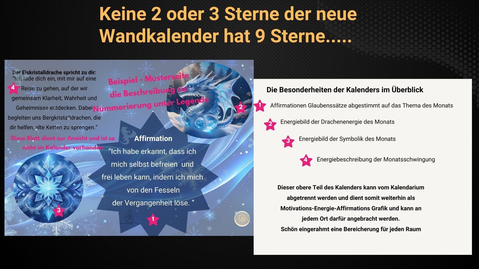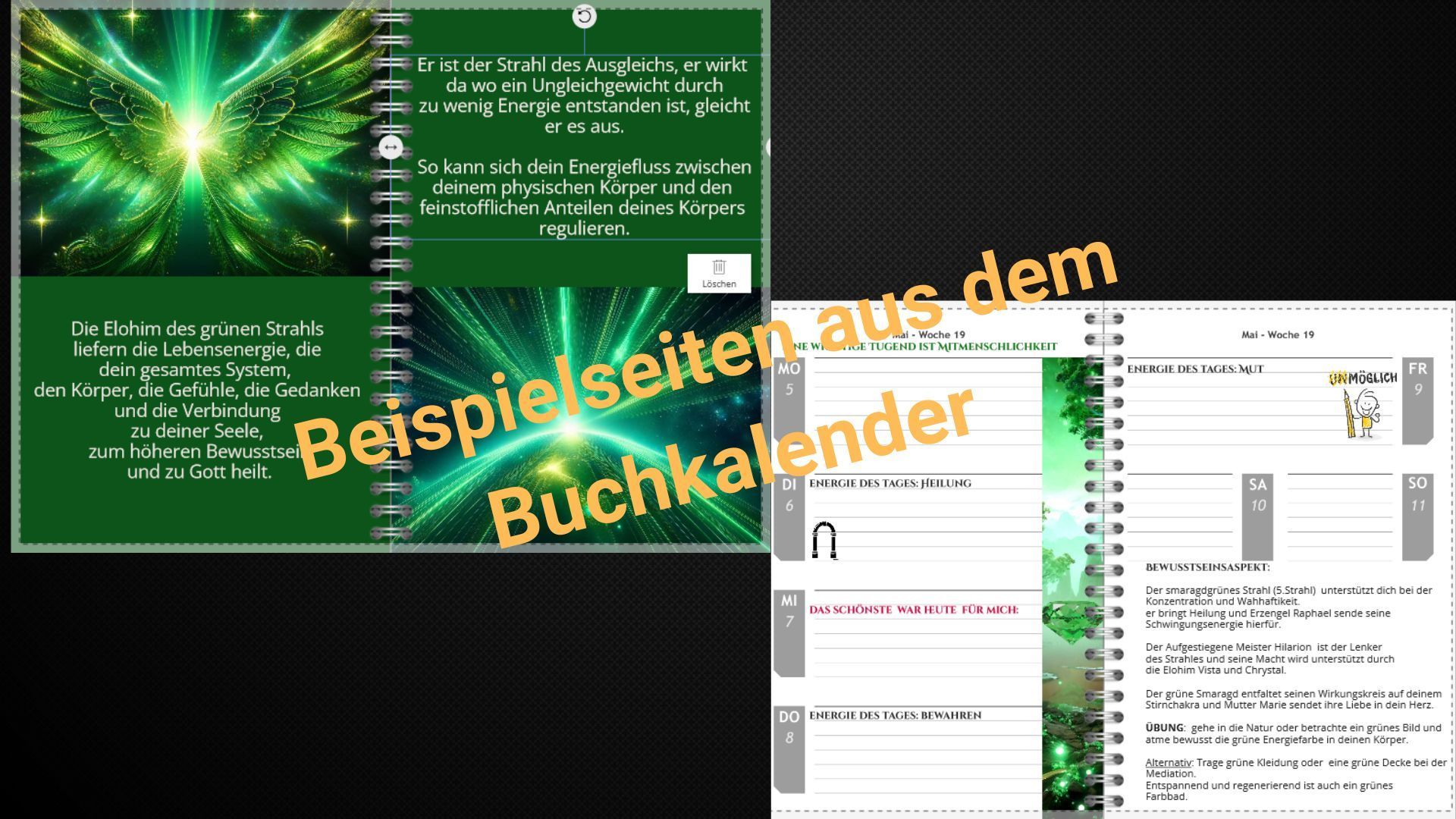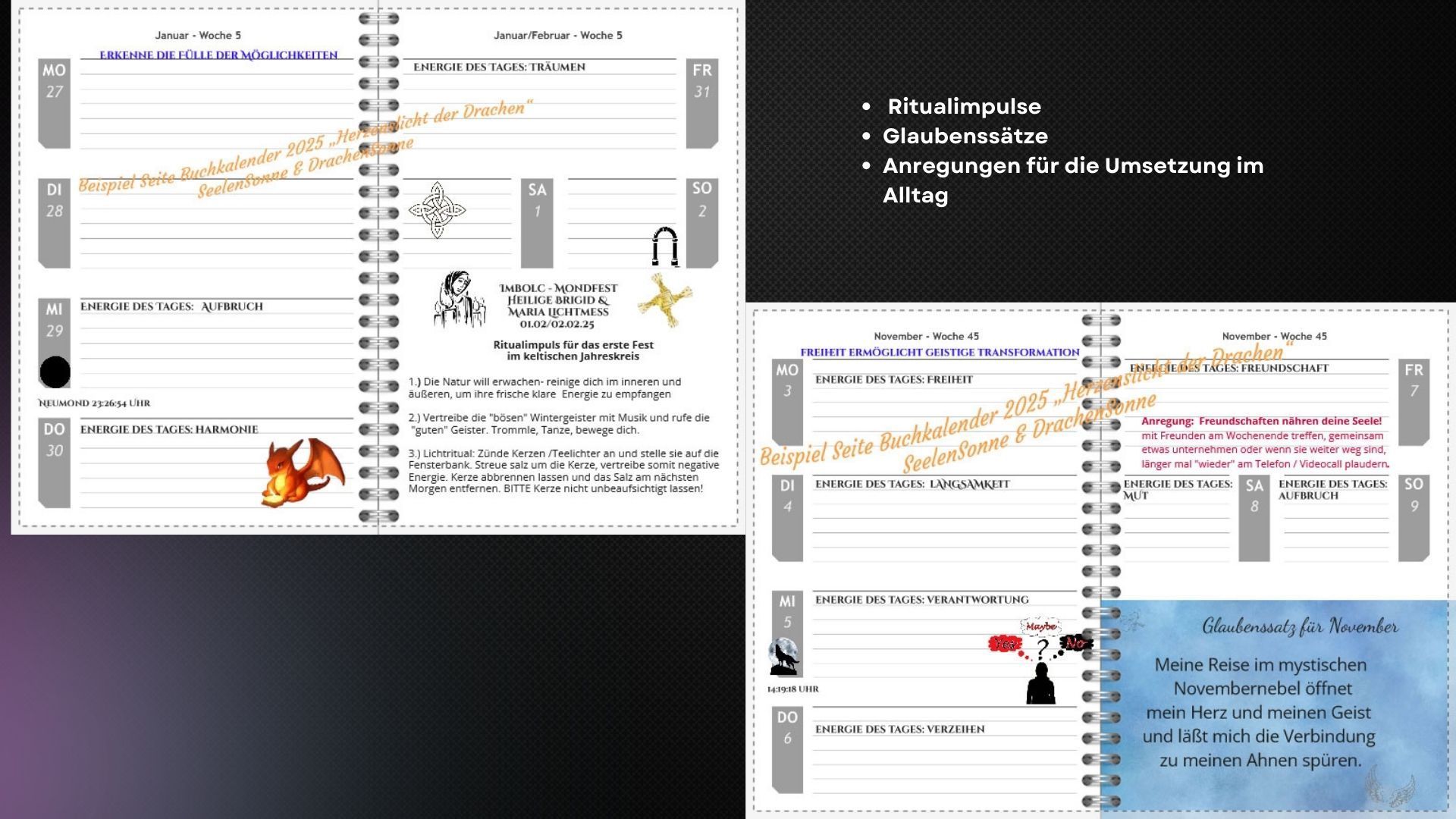 - Liebevoll kreiertes Energiebild: Jedes Monatsblatt hat dem entsprechenden Thema ein Bild erhalten, das mit der einzigartigen Energieschwingung des jeweiligen Monats verbunden ist, um dir eine visuelle Reise voller Zauber und Inspiration zu bieten.