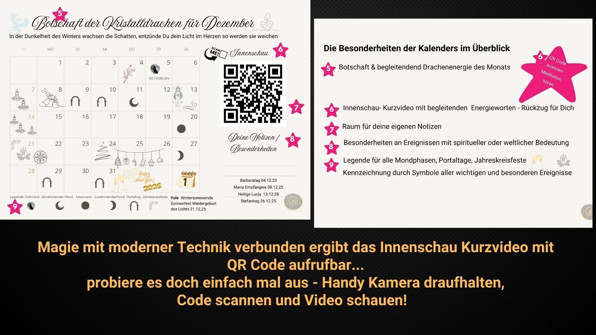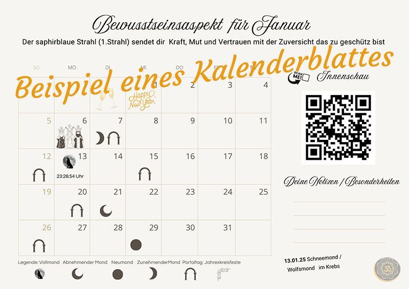 Auch hier kannst du auf dem Beispielbild "Januar" den QR Code scannen und einhören, was bei den 12 KalenderInnenschau Meditationsreisen so alles auf dich wartet.