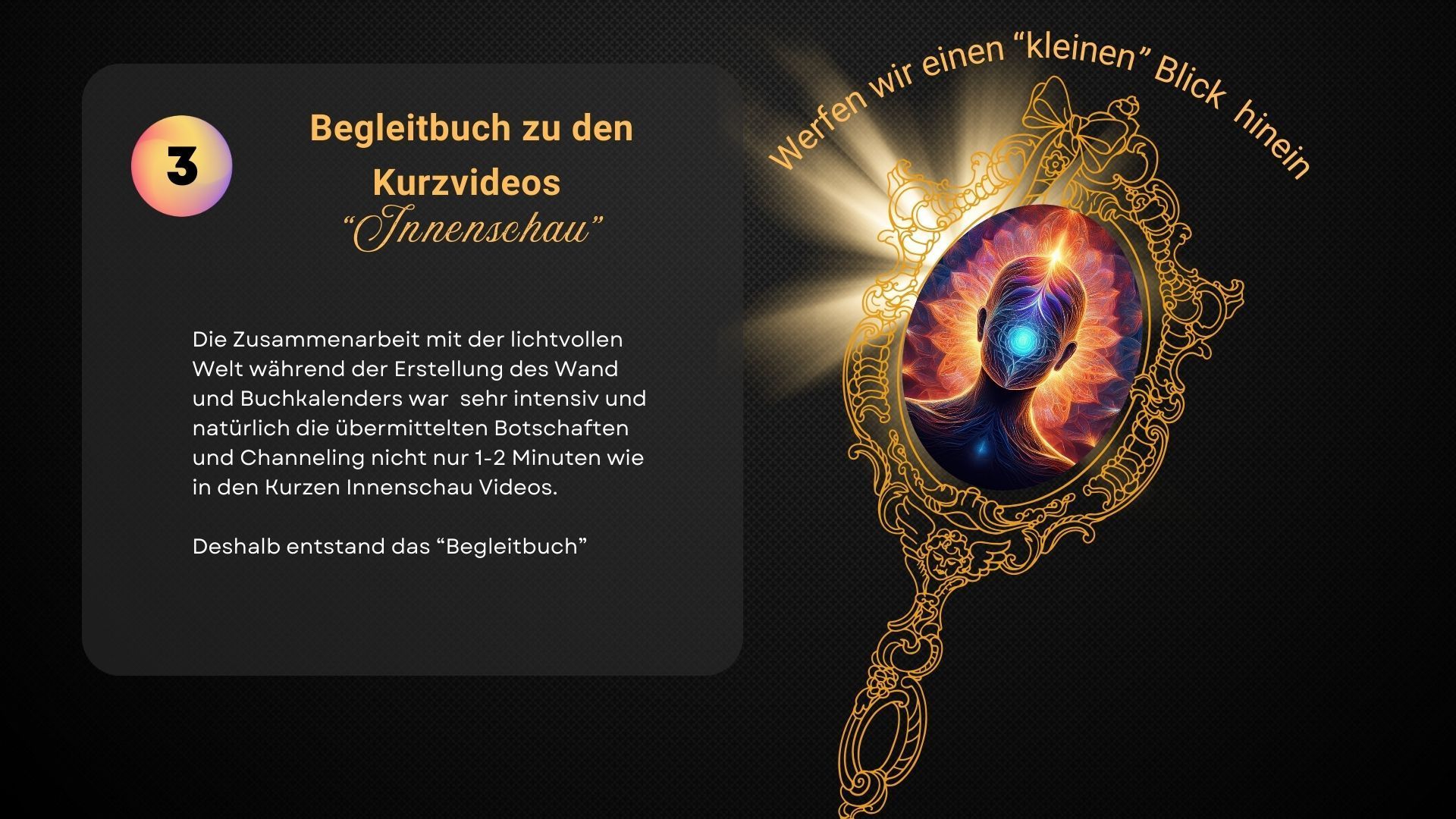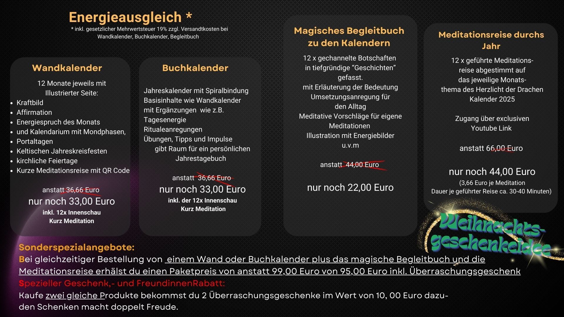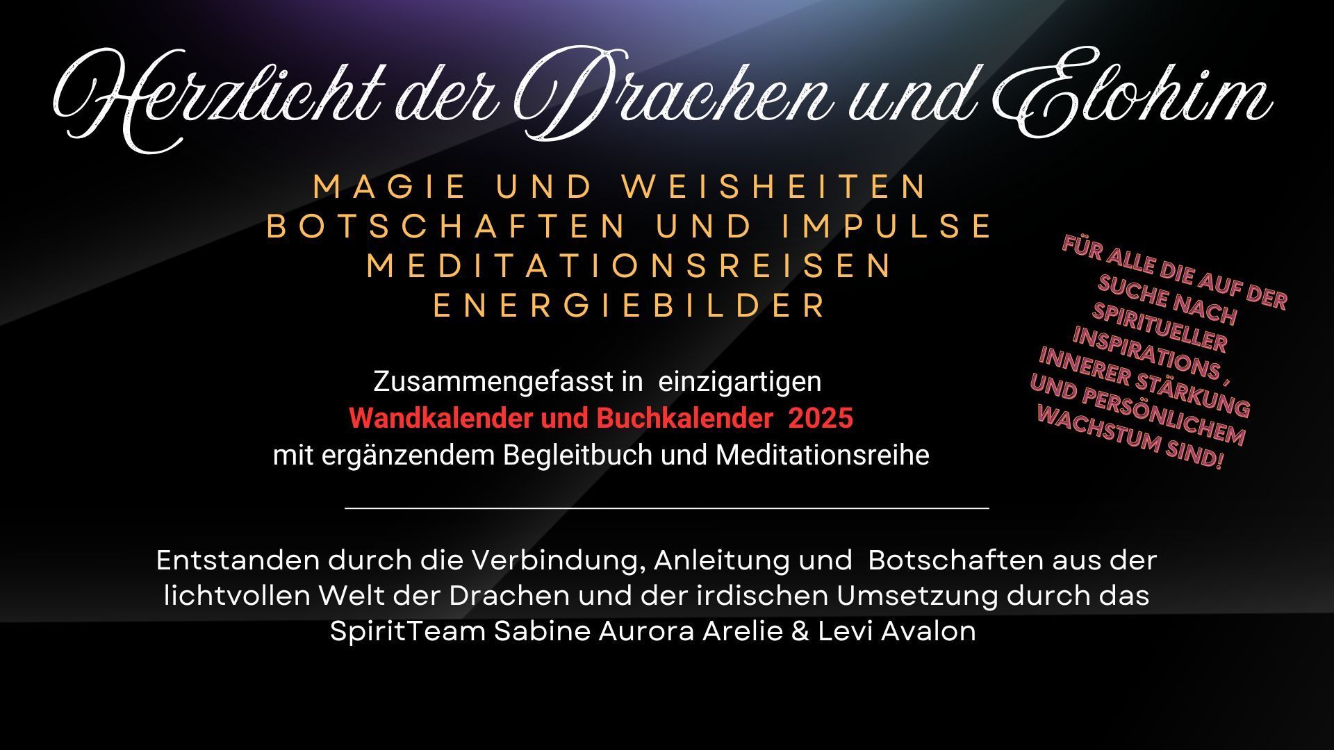 Durch die intensive Arbeit mit der lichtvollen geistigen Welt bekam das "Projekt" Kalender eine gewisse Eigendymamik und es entstanden einige Begleitwerke, wenn wir sie so nennen wollen. Aus dem Begleitbuch wurden geführte Meditationsreisen und so ergibt sich daraus für dich einen wundervolle harmonische Begleitung für alle Sinne für das gesamte Jahr 2025