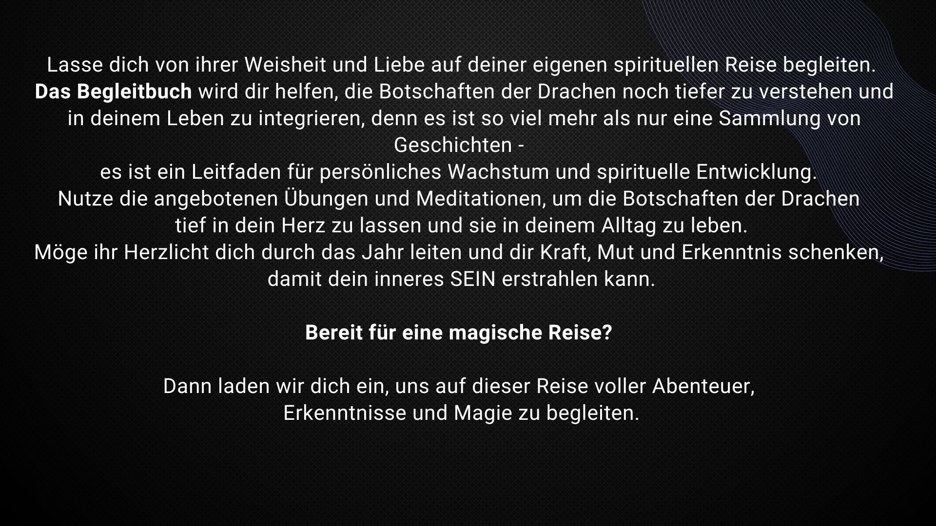 „Die Reise der Drachenseelen durch die Zeit“ führt dich mit tiefen Botschaften, magischen Geschichten und praktischen Ritualen durch die 12 Monate, zeitlos egal wann du beginnst.